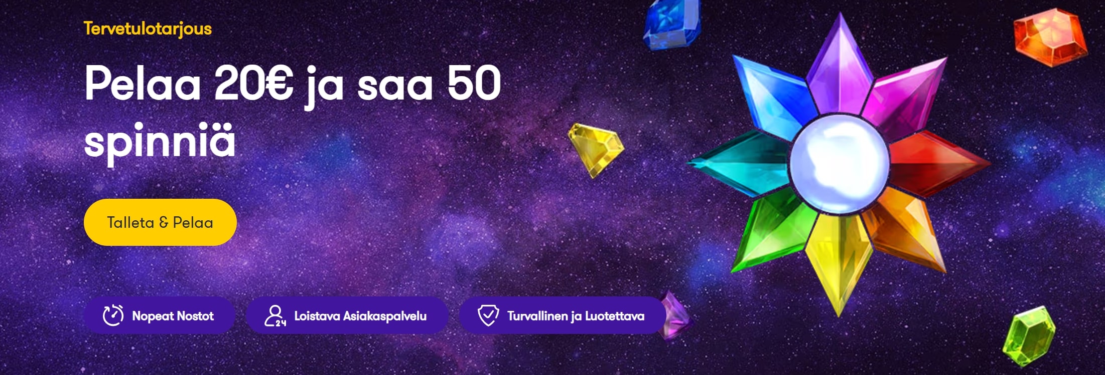 Tervetuliaispaketin kierrätysvaatimus on 35-kertainen, mikä on varsin kohtuullinen verrattuna moniin muihin verkkokasinoihin. Ilmaiskierrokset jaetaan 20 kierroksen päiväannoksina, ja ne toimivat suosituissa avaruusaiheisissa kolikkopeleissä kuten Starburst ja Cosmic Fortune. Bonus aktivoituu automaattisesti talletuksen yhteydessä, eikä erillisiä bonuskoodeja tarvita.